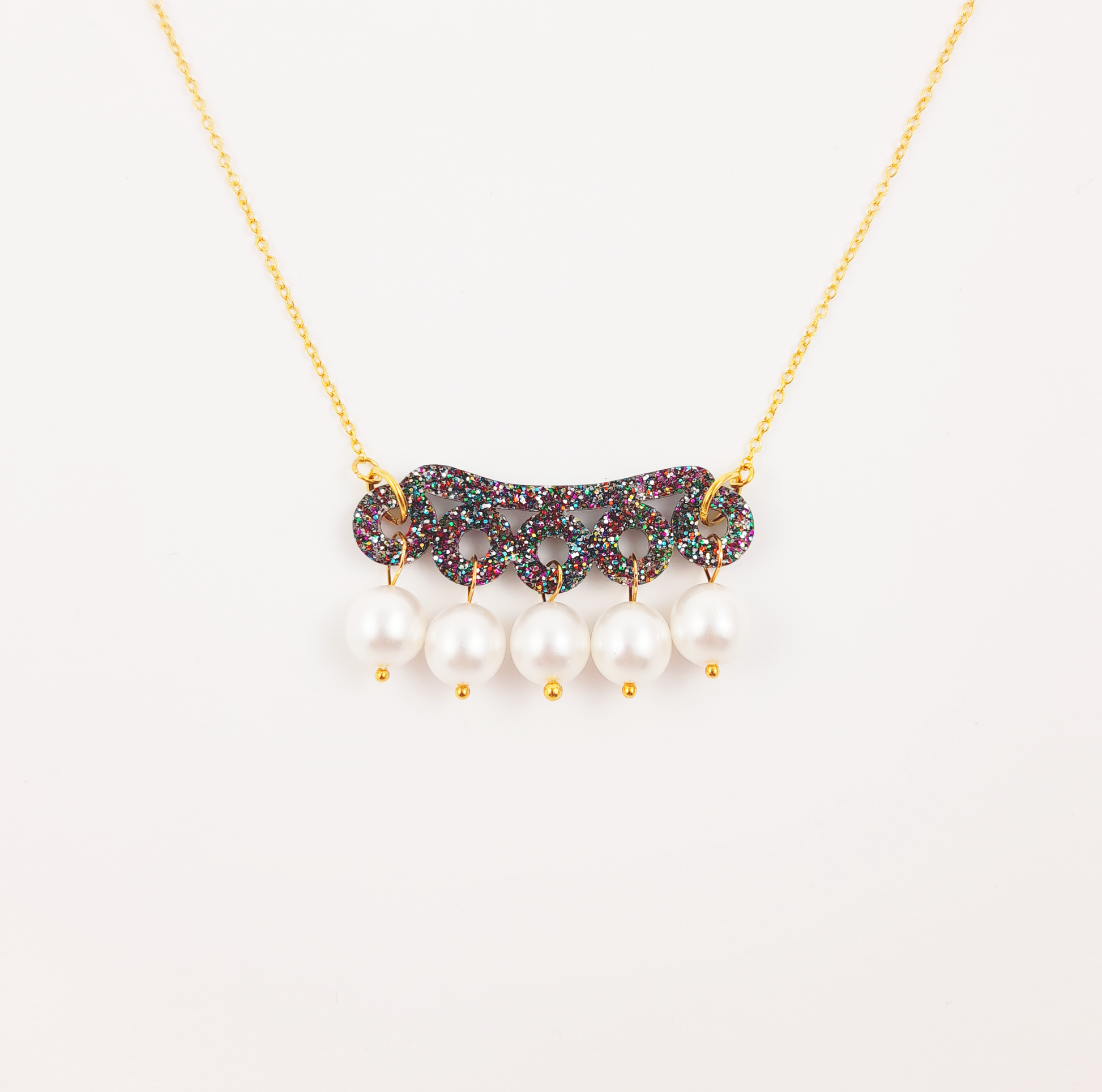 A delicate pearl fringe necklace with a contrasting pop of colour.