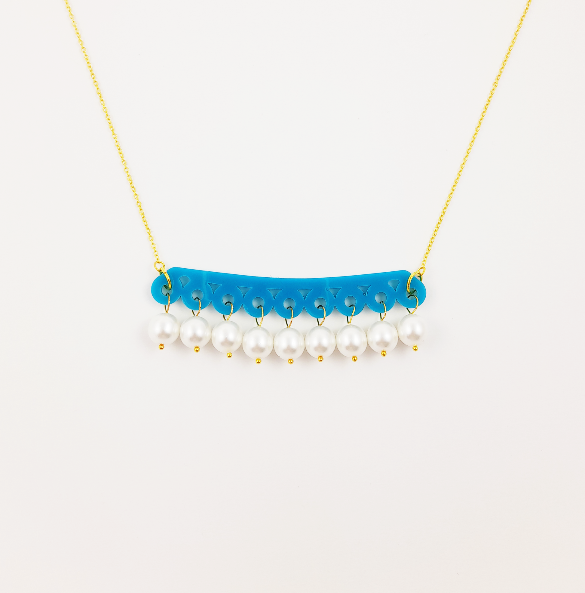 A delicate pearl fringe necklace with a contrasting pop of colour.